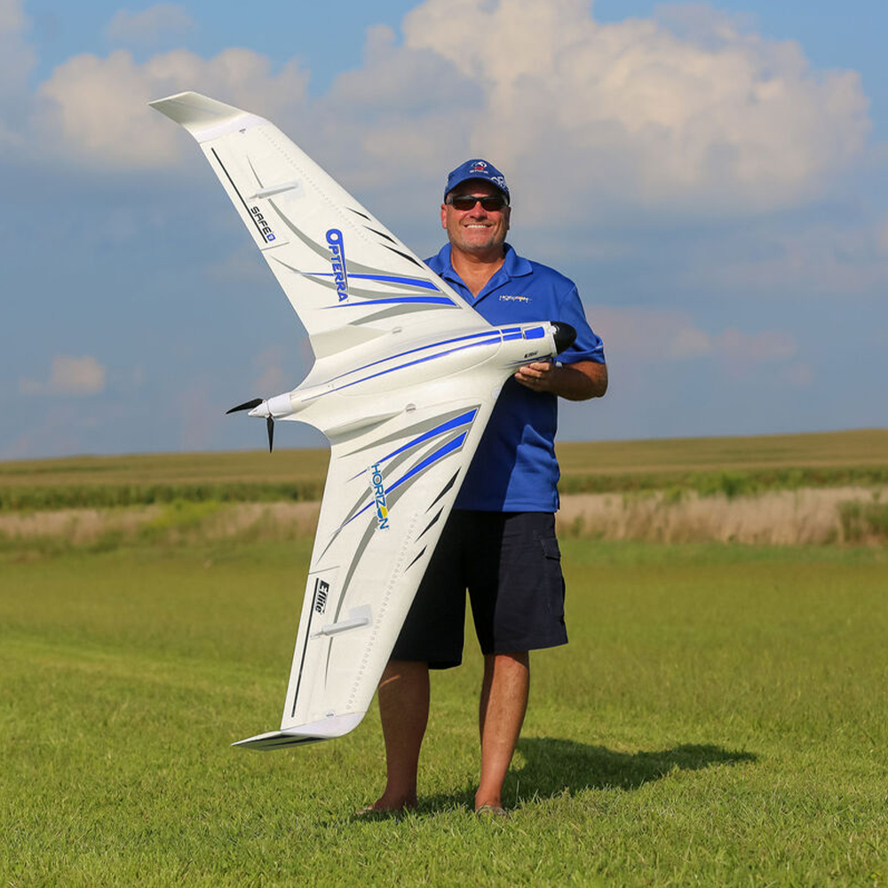 The Opterra™ 2m flying wing is the collaborative effort of George Hicks and Mike McConville – two of model aviation’s premier aircraft designers. Together, they have created some of the best flying RC airplanes in the world. This one is no exception. Its lightweight construction, long wingspan and efficient aerodynamics give it a wide range of capabilities that includes everything from sport aerobatics to soaring. It even gives you the ability to put yourself in the pilot’s seat with FPV gear while using a GoPro Hero 3, Hero 4 or similar class camera to record HD video at the same time.* This Bind-N-Fly® version comes with the added benefit of a Spektrum™ AS3X® receiver that features optional SAFE® Select technology.