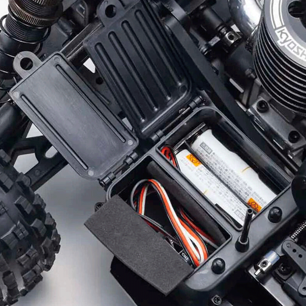 Sensitive electronics such as the receiver are encased inside a sealed radio box that protects them from dirt and dust. Radio box also incorporates battery holder.Suspension
