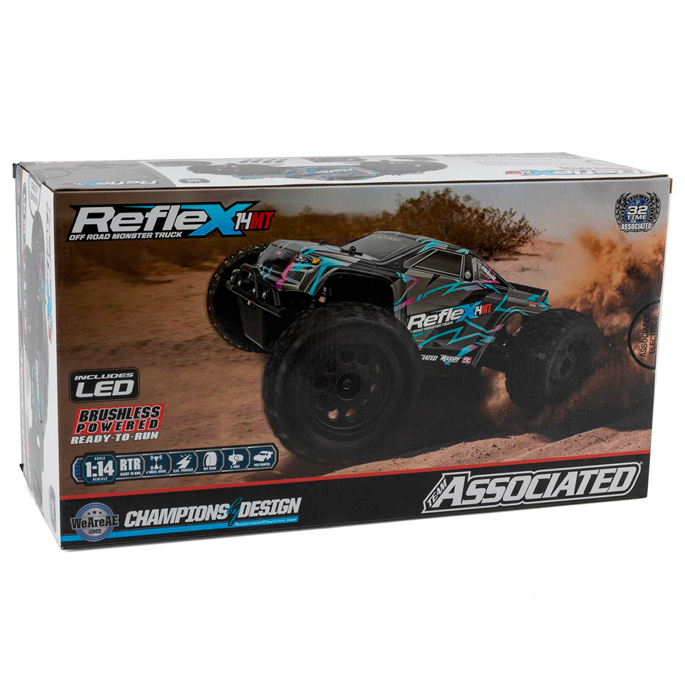 It features a Reedy Power brushless speed control and motor, hightorque digital steering servo, and 2.4GHz radio system. With all that power available at your disposal, you know this monster truck was designed with performance in mind. The versatility offered by the allterrain tires, adjustable wheelie bar, turnbuckles, caster blocks and rear hubs make the Reflex 14MT ready for any terrain you can throw at it.