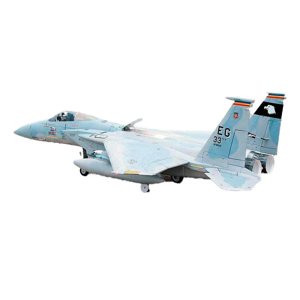 Freewing’s F-15C boasts a powerful single 90mm power system and features a range of scale details which set it apart from any other electric F-15. Accurate aircraft lighting using “Daybright” LEDs, sequenced gear doors and landing light, aluminum landing gear struts with ample compression for operation on short grass or pavement, and metal trunnion retracts for durability. The aircraft also features highly detailed 30 piece plastic exhaust nozzles which rival the 3D detail level of RC turbine jets costing thousands of dollars, and an electric speed brake which works in conjunction with the flaps to stabilize that perfect scale landing approach. The elevator mounting and control hardware is reinforced to provide rigidity in high-G maneuvers. Each F-15C also uses over 100 waterslide decals, meticulously applied at the factory by hand to finish off the iconic look of an F-15C Eagle.