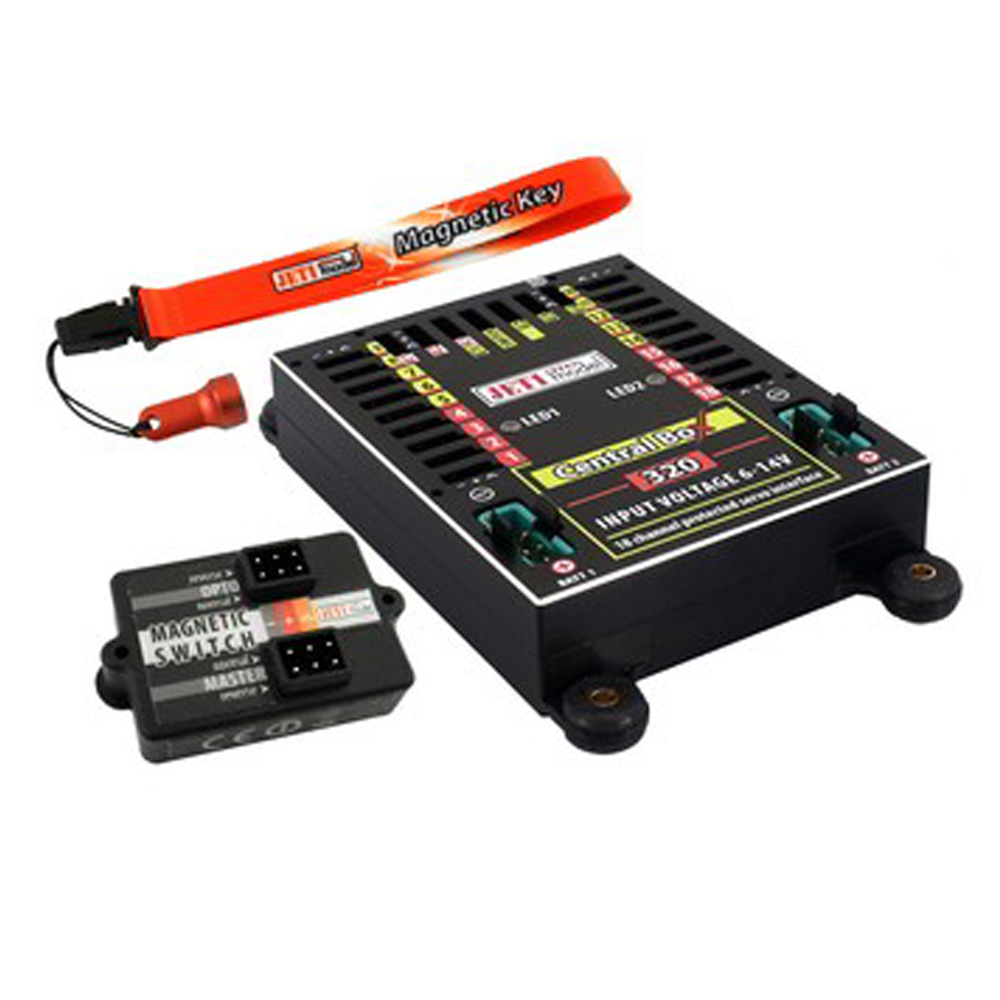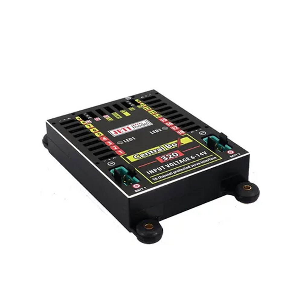 - The Jeti Central Box 320 has a unique design that provides overload protection for up to 10 Standard (up to 415 oz/in, 30 kg/cm) and 8 Ultra-Torque (up to 830 oz/in, 60 kg/cm) servos. The Jeti Central Box 320 features true Battery Redundancy, Ditex Servo Telemetry, Jeti EX Telemetry, and up to three (3) receiver inputs (2x 2.4GHz and 1x 900MHz) with serial (PPM, EX Bus) output for complete Power & RF Signal Redundancy. In addition, the Jeti Central Box 320 has up to four (4) independent E1/E4 telemetry inputs. The onboard BEC allows the output voltage for the servo to be adjusted from 5V to 8.4V in 0.1V steps using the Jeti Transmitter Device Explorer interface.