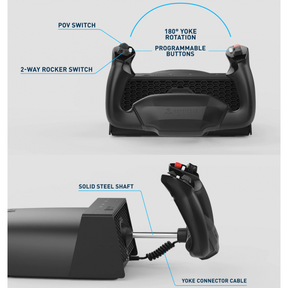 180° yoke rotation with self-centering mechanism and minimal dead zone for precise control and exact maneuvers, inspired by real aircraft and optimized for PC flight simulators.