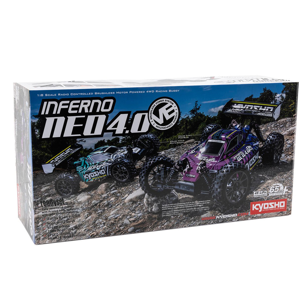 - Equipped with waterproof, metal gear KS5071-09MW servos, the NEO 4.0 ensures high-torque control through rough conditions. The big-bore oil shocks and double wishbone suspension soak up harsh terrain, while turnbuckle-style rods make it easy to adjust alignment settings. The included KT-231P+ transmitter provides precise control with ergonomic comfort and customizable settings, and the factory-mounted Inferno NEO 4.0 VE body offers excellent aerodynamics and stability right out of the box.
