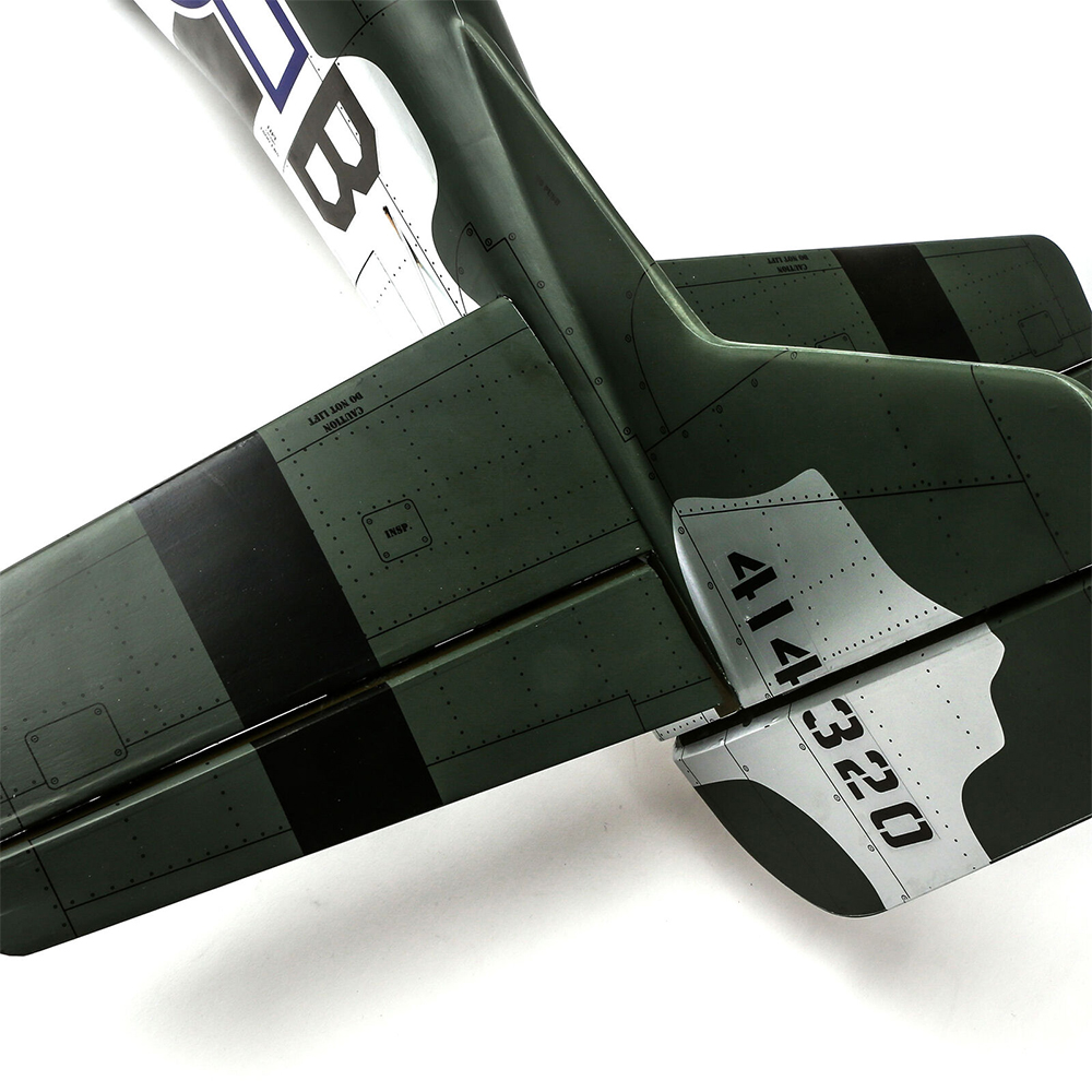 Leading the list of stunning details is the expertly applied, satin-finish covering of the sleek airframe. The lightweight material captures scale features like panel lines, rivets, stenciling and distinct colors for a brilliant appearance that's also durable. Bringing its authenticity even further is a well-appointed cockpit with a 3D instrument panel, an intricately painted pilot figure and faceted utility compartment. The updated cowling with a more scale-like shape features a matching finish with inlets and exhaust, plus a matching spinner. Optional-use wing tanks can be attached on the included wing pylons, or removed to improve high-speed maneuverability. Functional shock-absorbing gear struts include scale-style axles with room for the large wheels that make flying from grass easier.