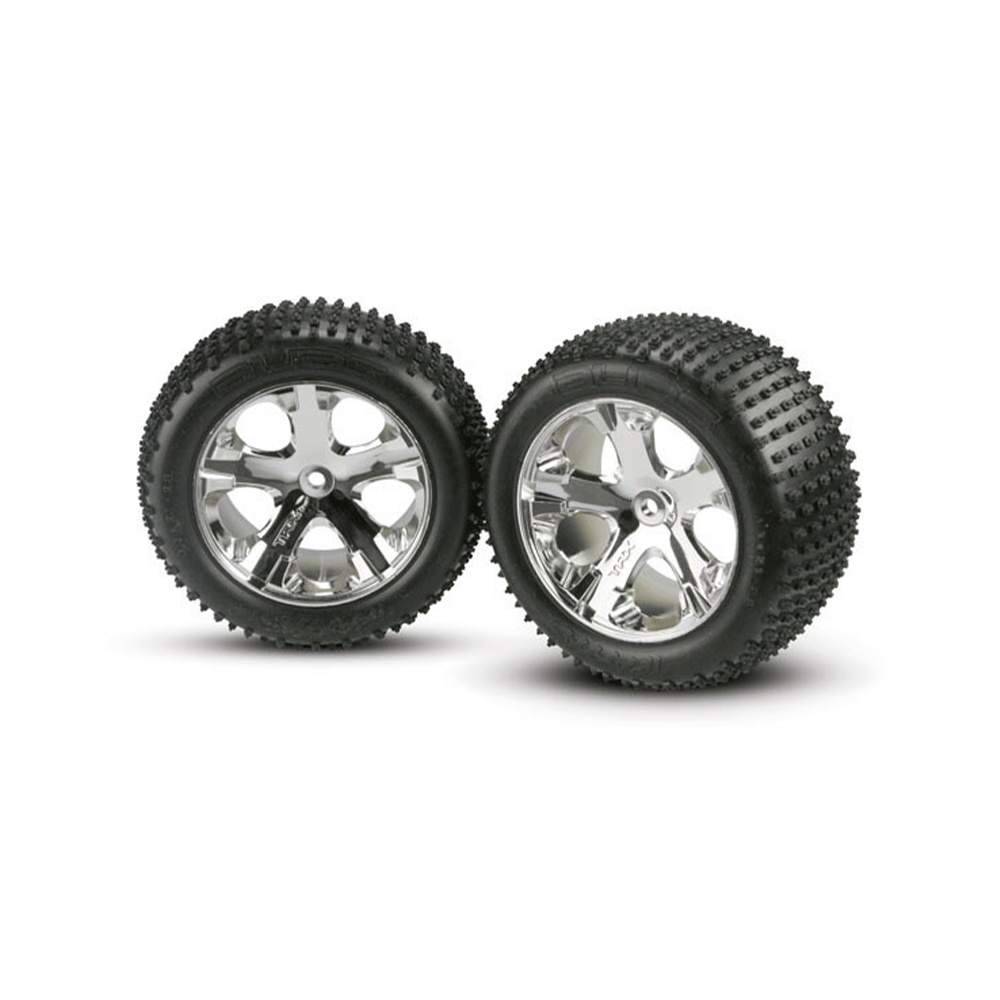 Alias® step-pin tires provide excellent traction in dirt and other loose surfaces. The tires come mounted with foam inserts and pre-glued to 2.8" chrome All-Star wheels for no-hassle, out-of-the-box bolt-on installation. Fits 12 mm hex, 2WD electric rear.